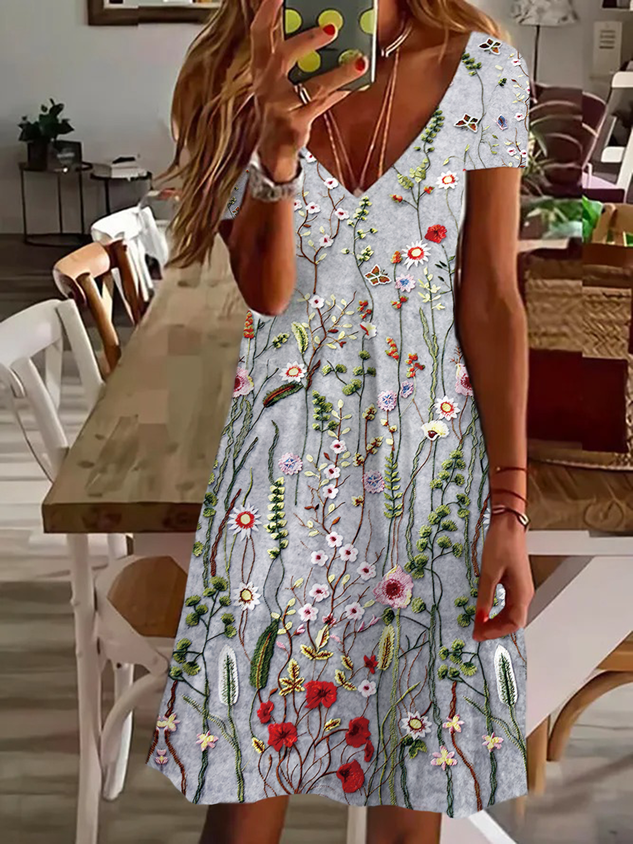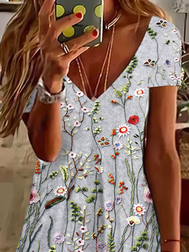 Vacation Loose Floral V Neck Dress