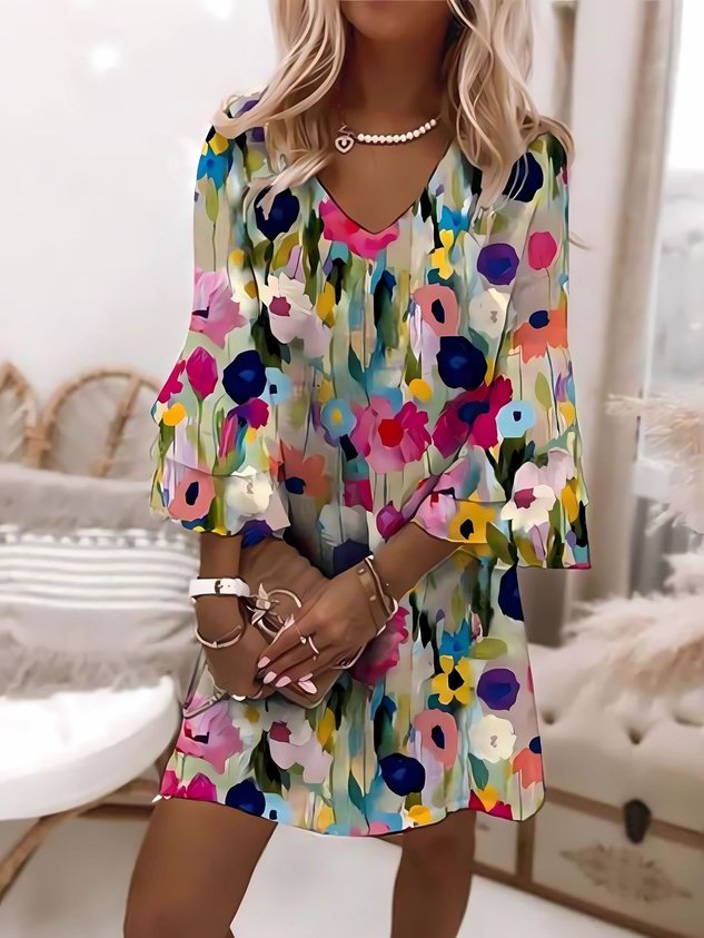 V Neck Floral Casual Regular Fit Dress With No