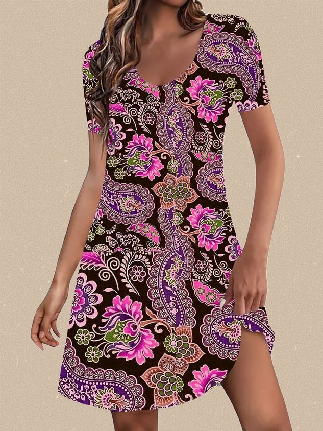 Floral Print Short Sleeve Crew Neck Dress