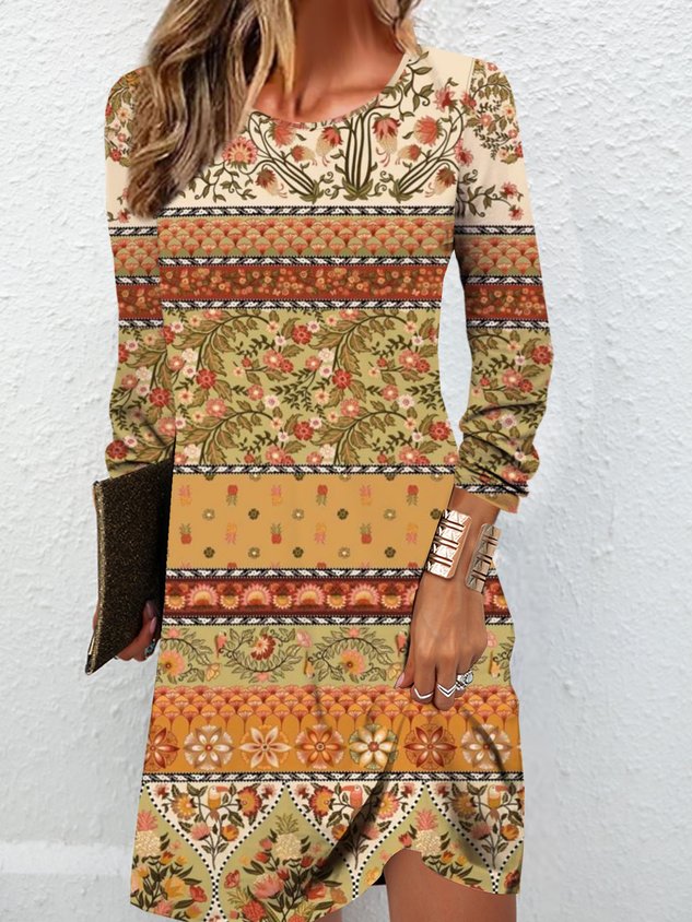 Floral ethnic pattern printed round neck casual long sleeved women's dress
