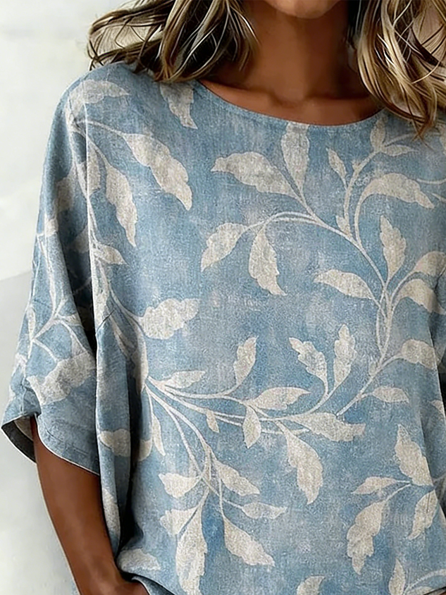 • Cotton And Linen Vintage Floral Crew Neck Shirt