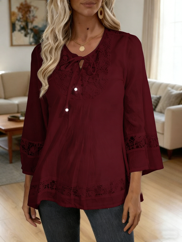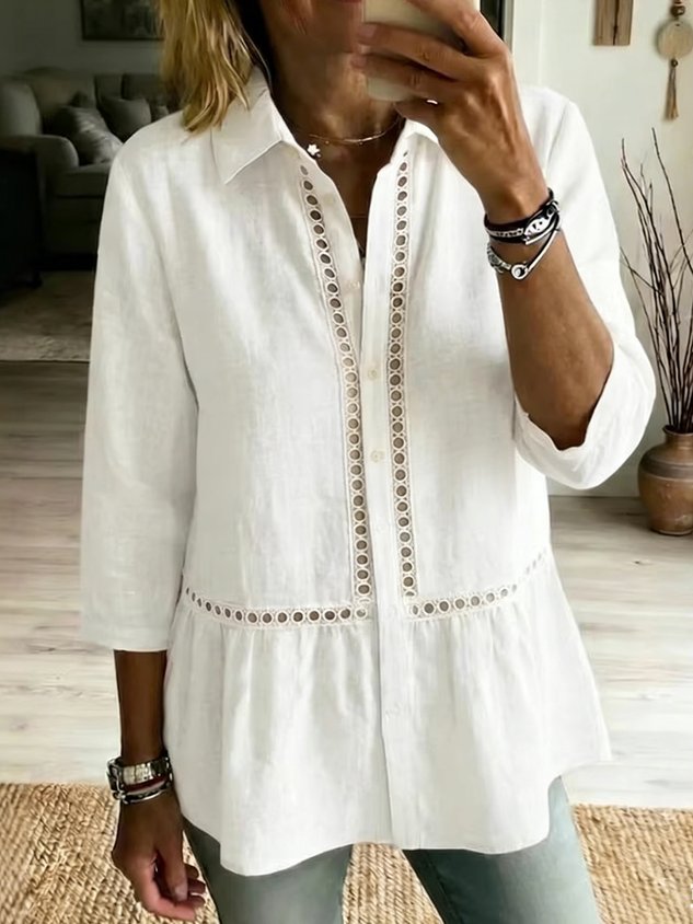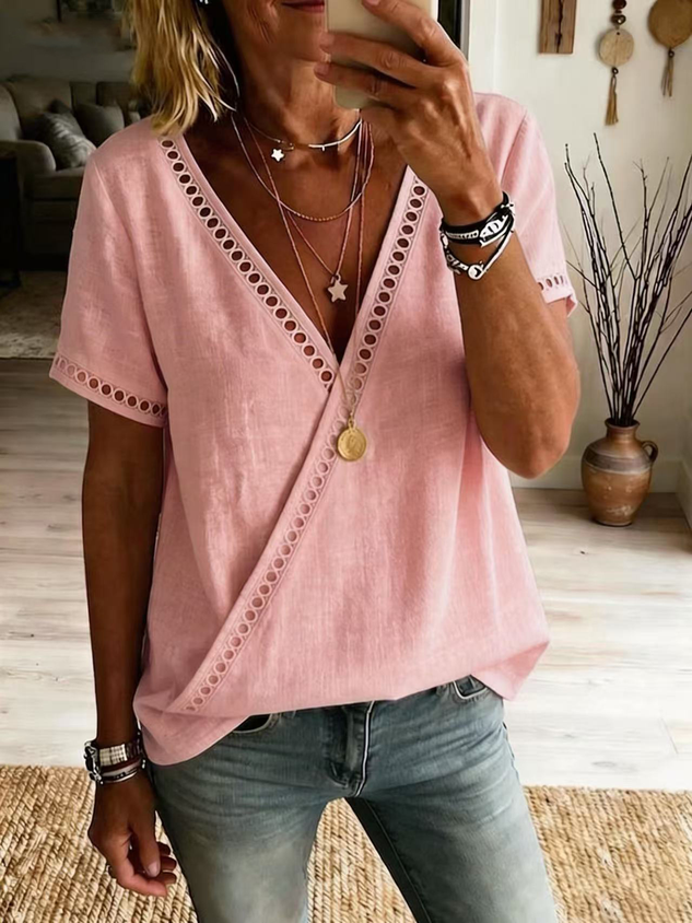 • Elegant Plain Loose Polyester Cotton V Neck Perforated Lace Casual Top
