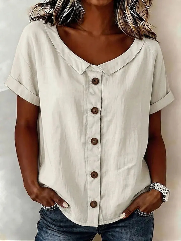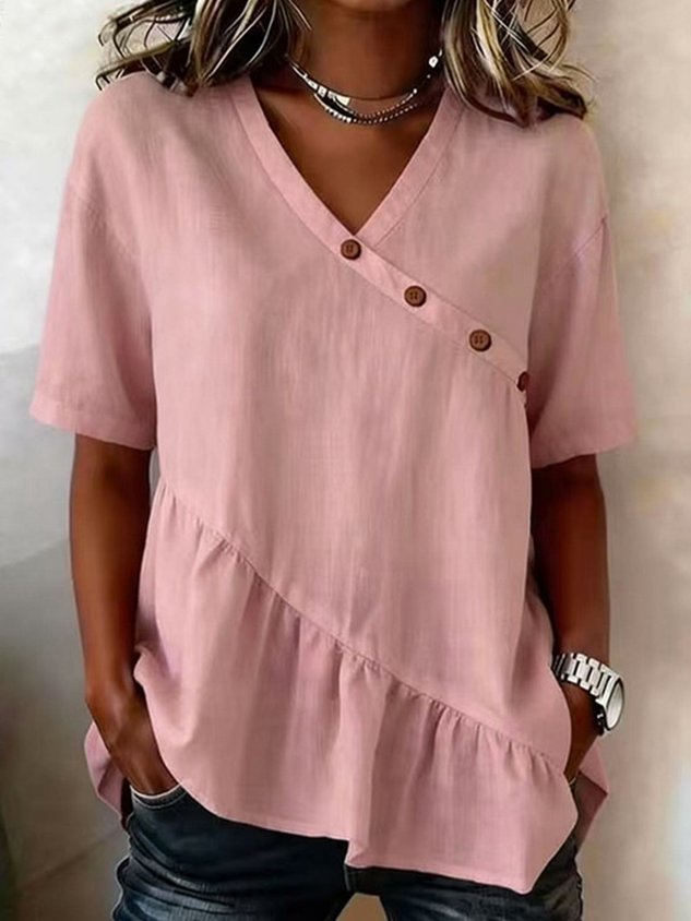 • Cotton And Linen V Neck Short Sleeve Button Summer Going Out Casual Shirt