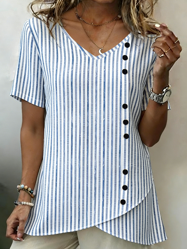 • Striped Cotton And Linen Elegant V Neck Shirt