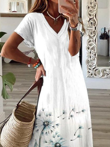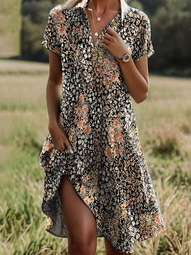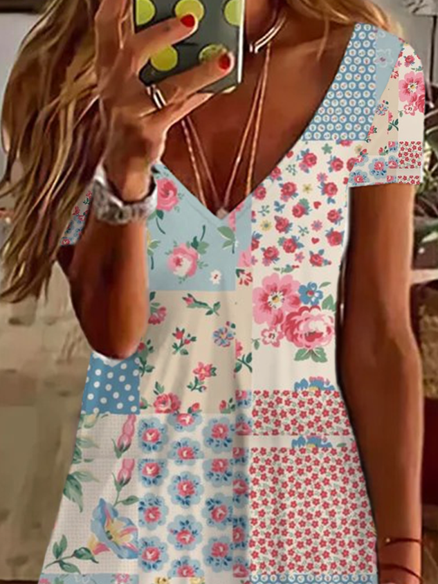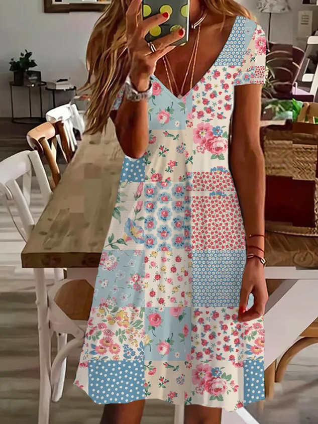 Casual Floral Short Sleeve V Neck Printed Dress