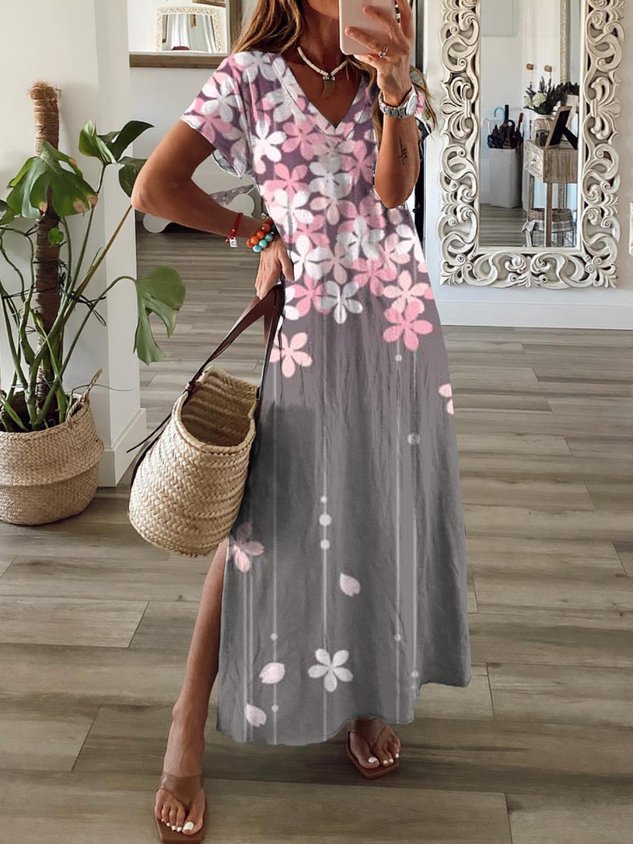 Women's Floral Spring Short Sleeve V-Neck Slit Dress