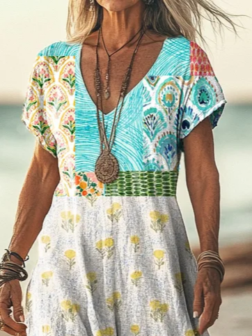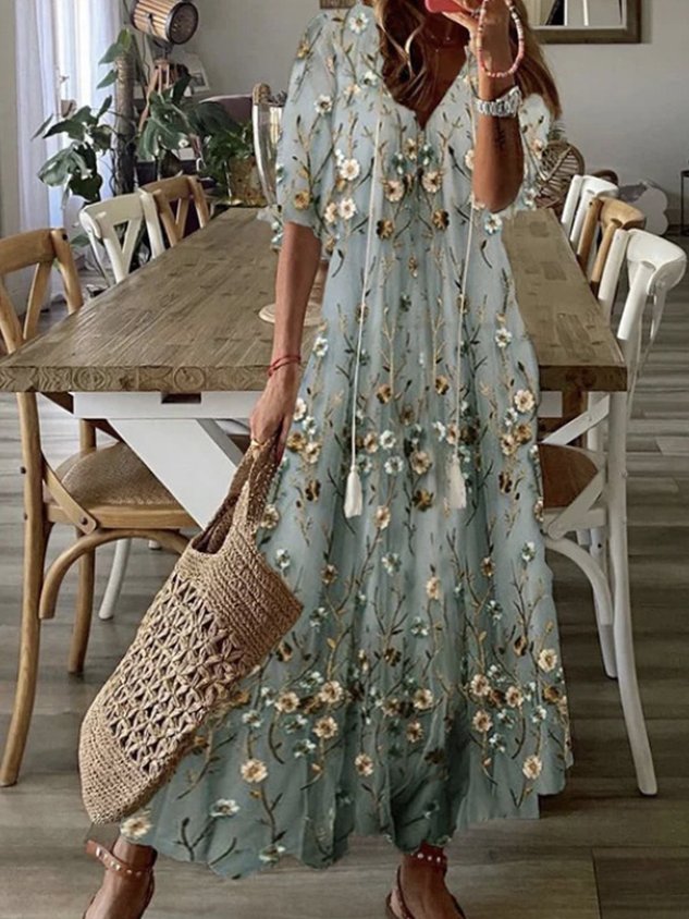 Casual H-Line V Neck Lightweight Geometric Floral Printed Short Sleeve Maxi Dress