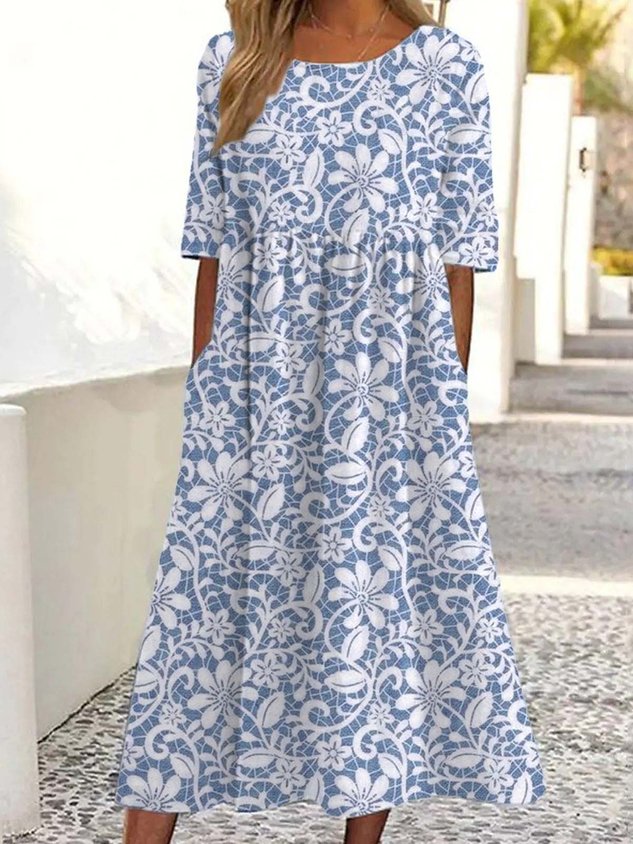 Crew Neck Floral Casual Dress With No