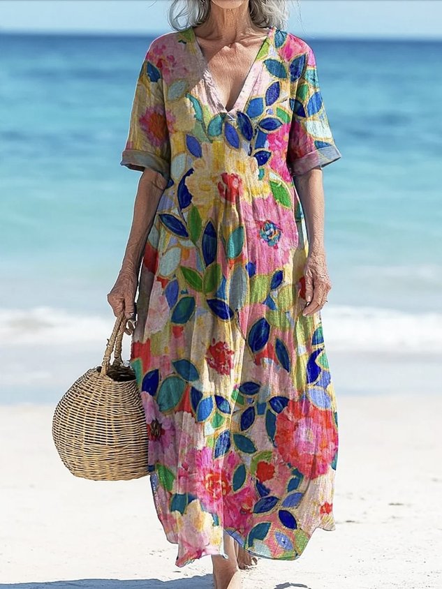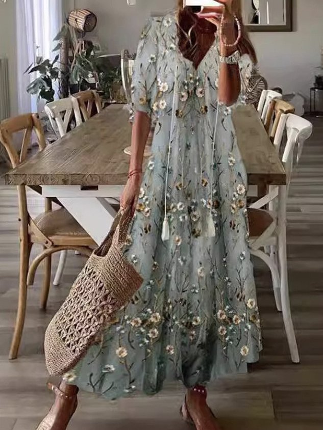 Casual Floral V Neck Dress