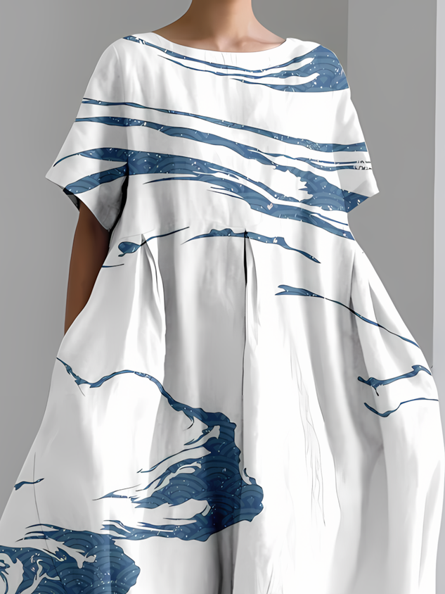 Women's Artistic Floral Print Vintage Round Neck Pleated Dress