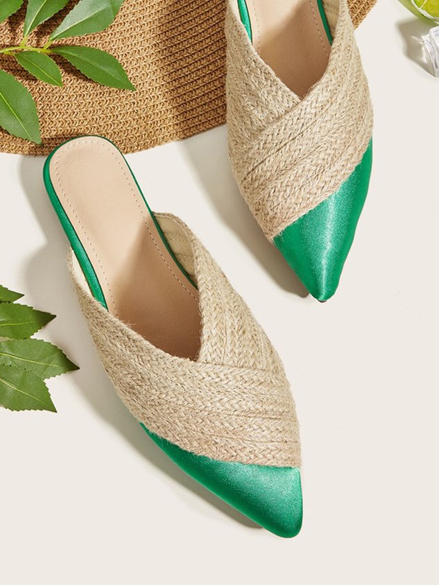 Color-block Satin Straw Weaved Vacation Flat Mules