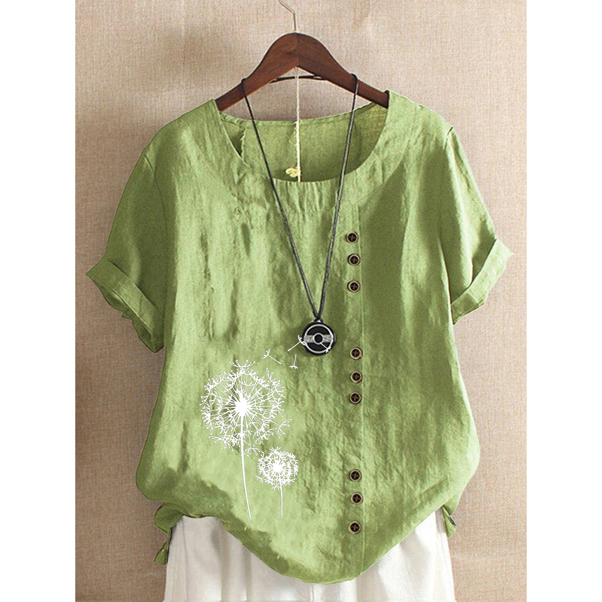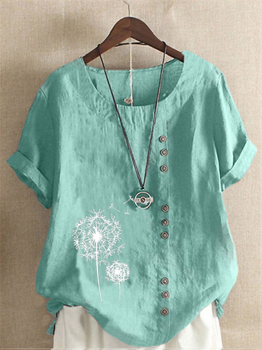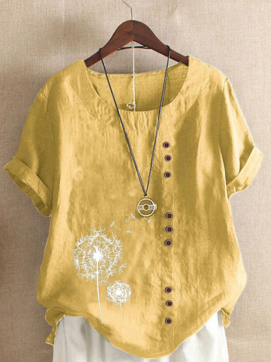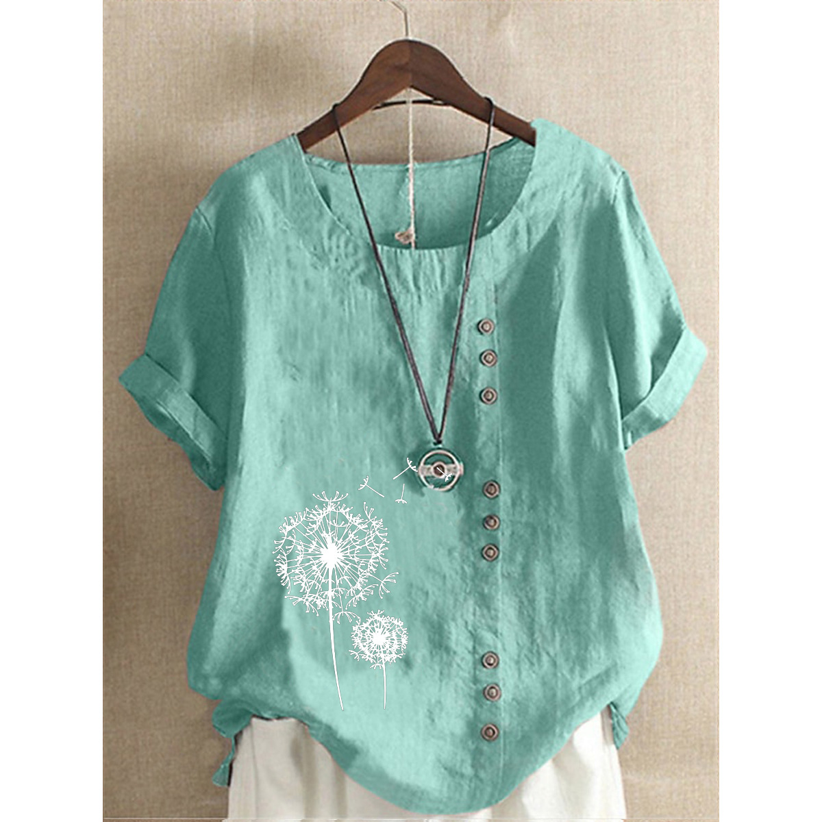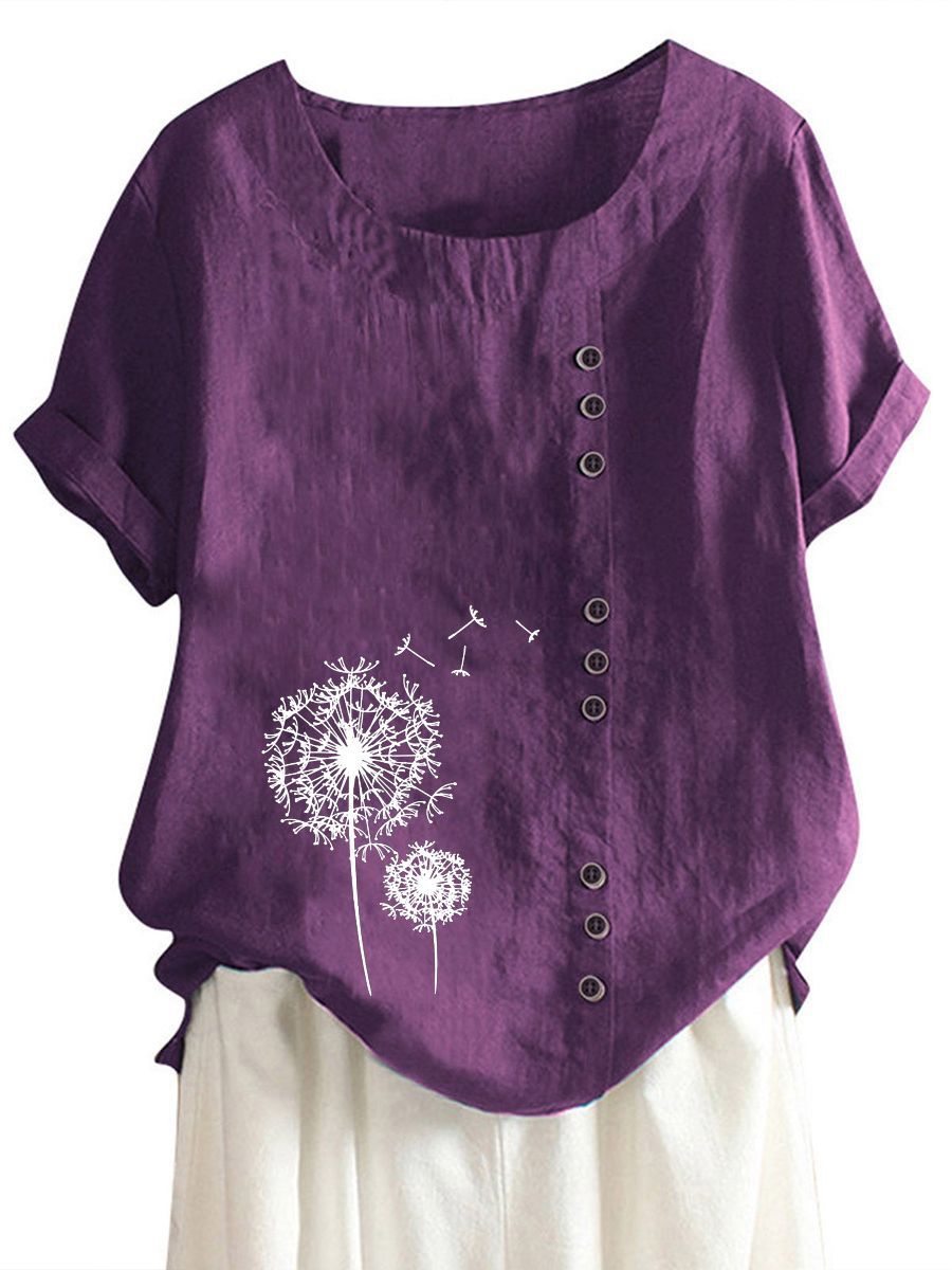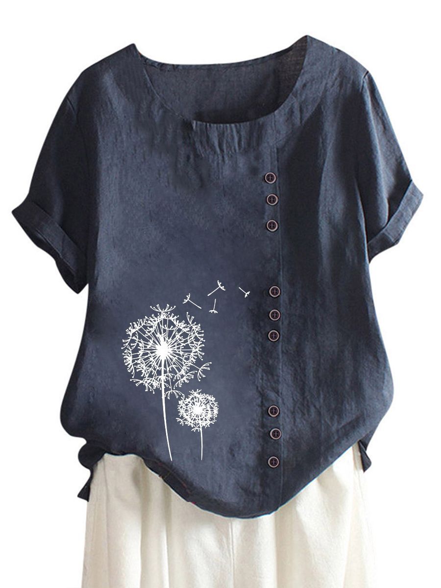 Button Short-sleeved Printed Casual Street Round Neck Regular Cotton and Linen Top T-shirt