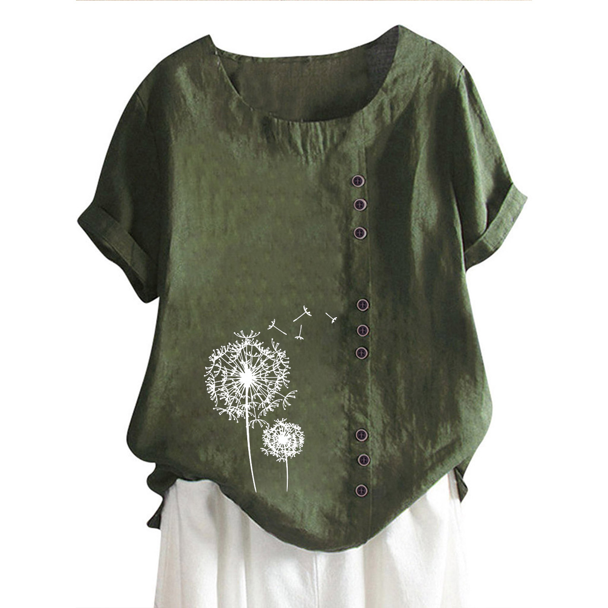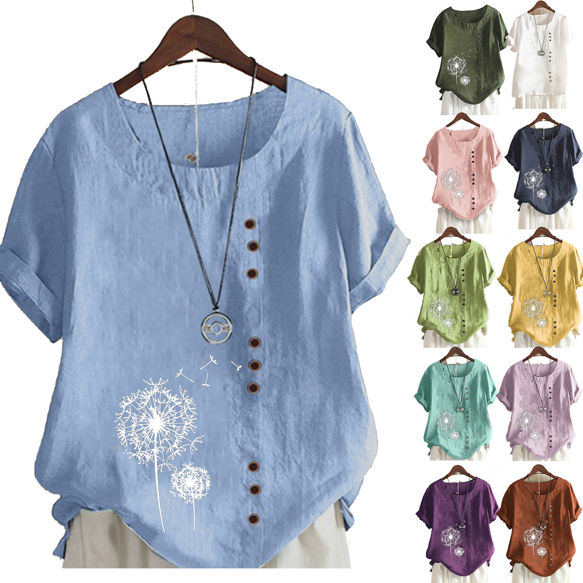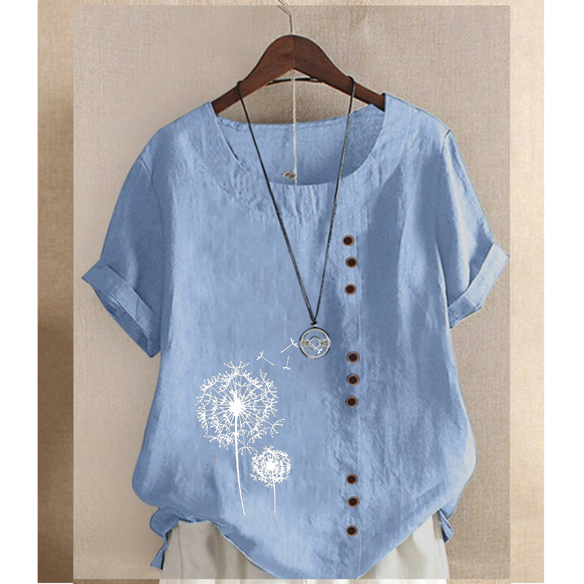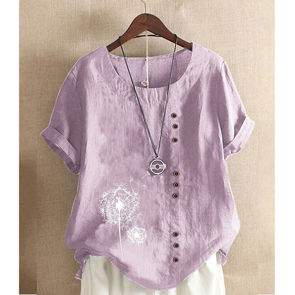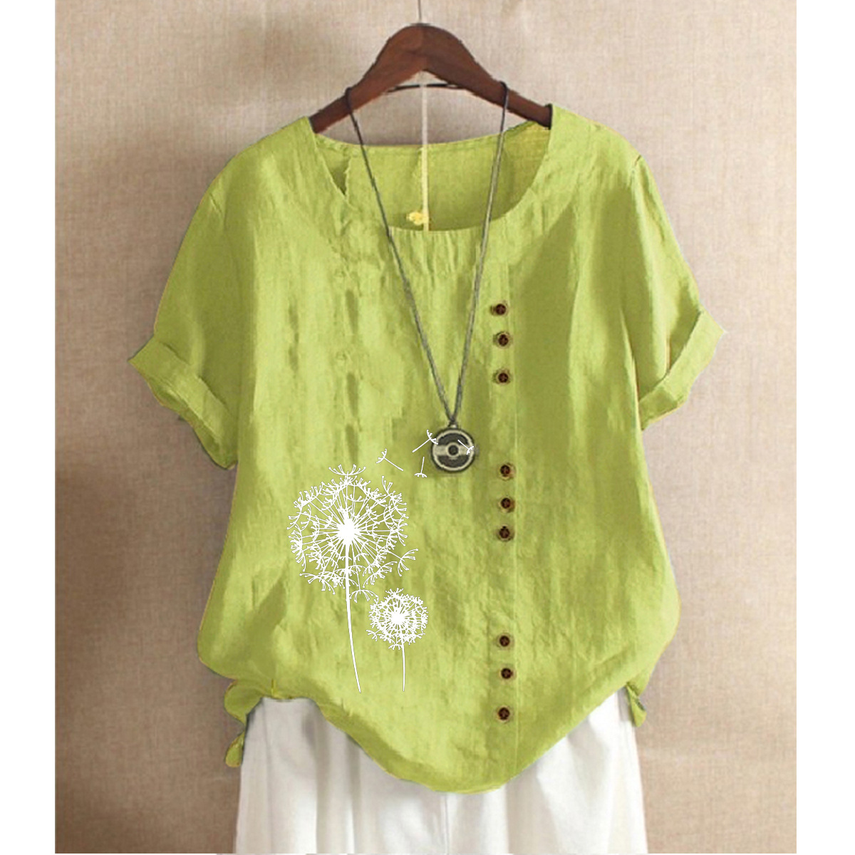 Button Short-sleeved Printed Casual Street Round Neck Regular Cotton and Linen Top T-shirt