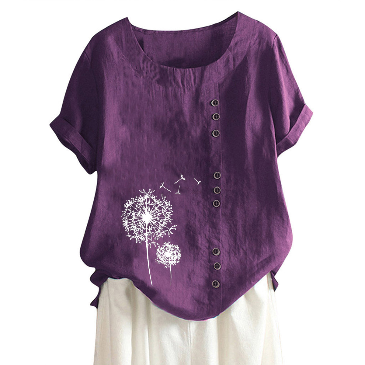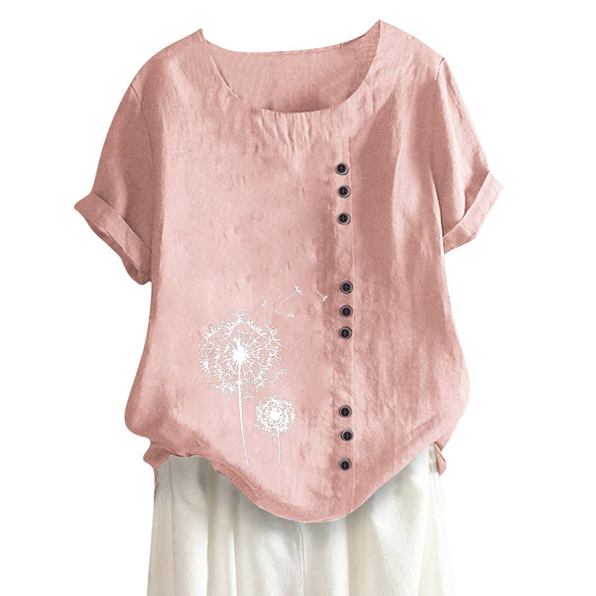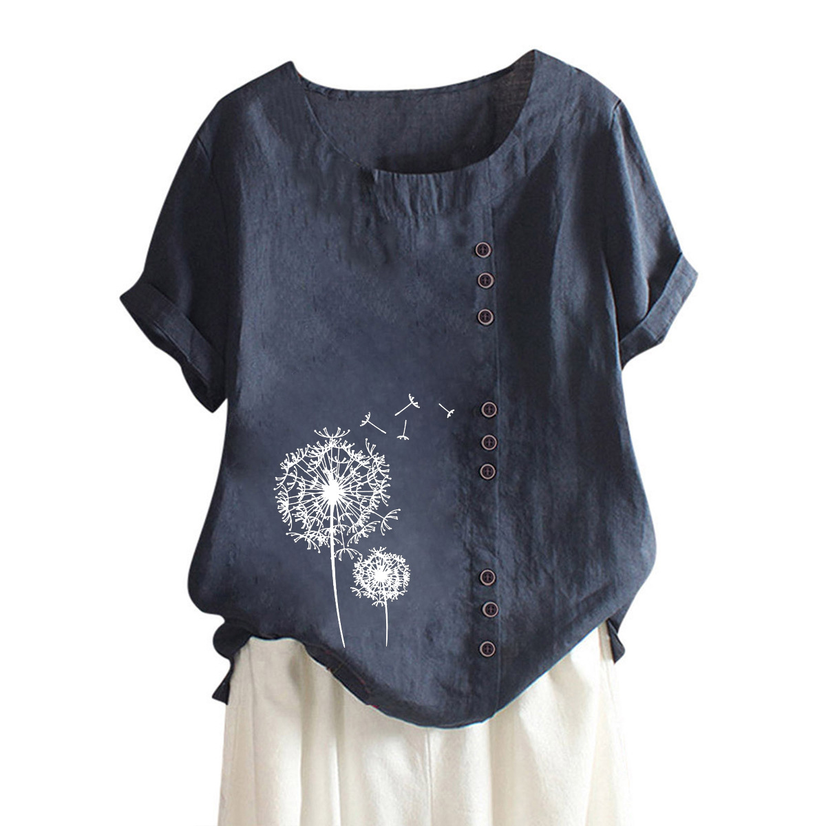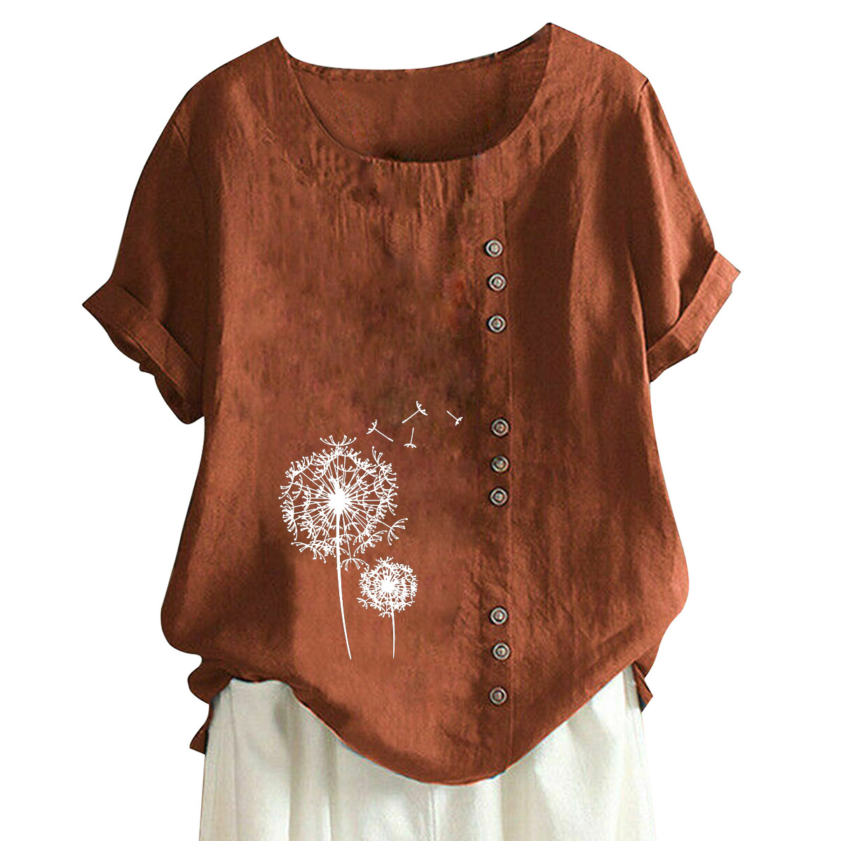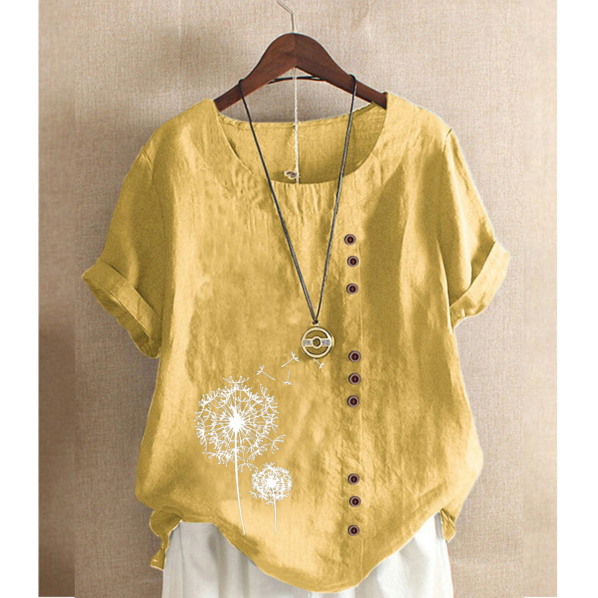 Button Short-sleeved Printed Casual Street Round Neck Regular Cotton and Linen Top T-shirt
