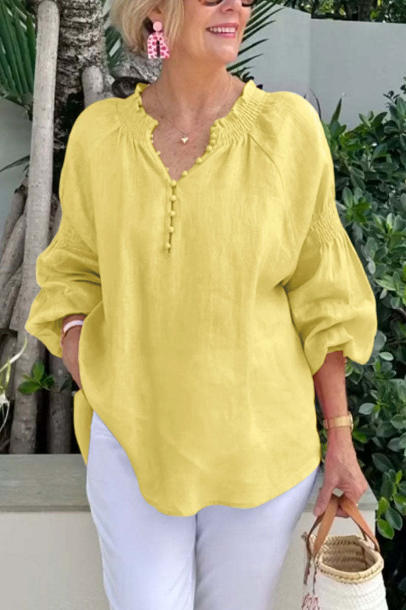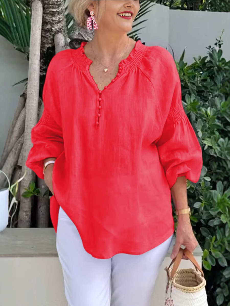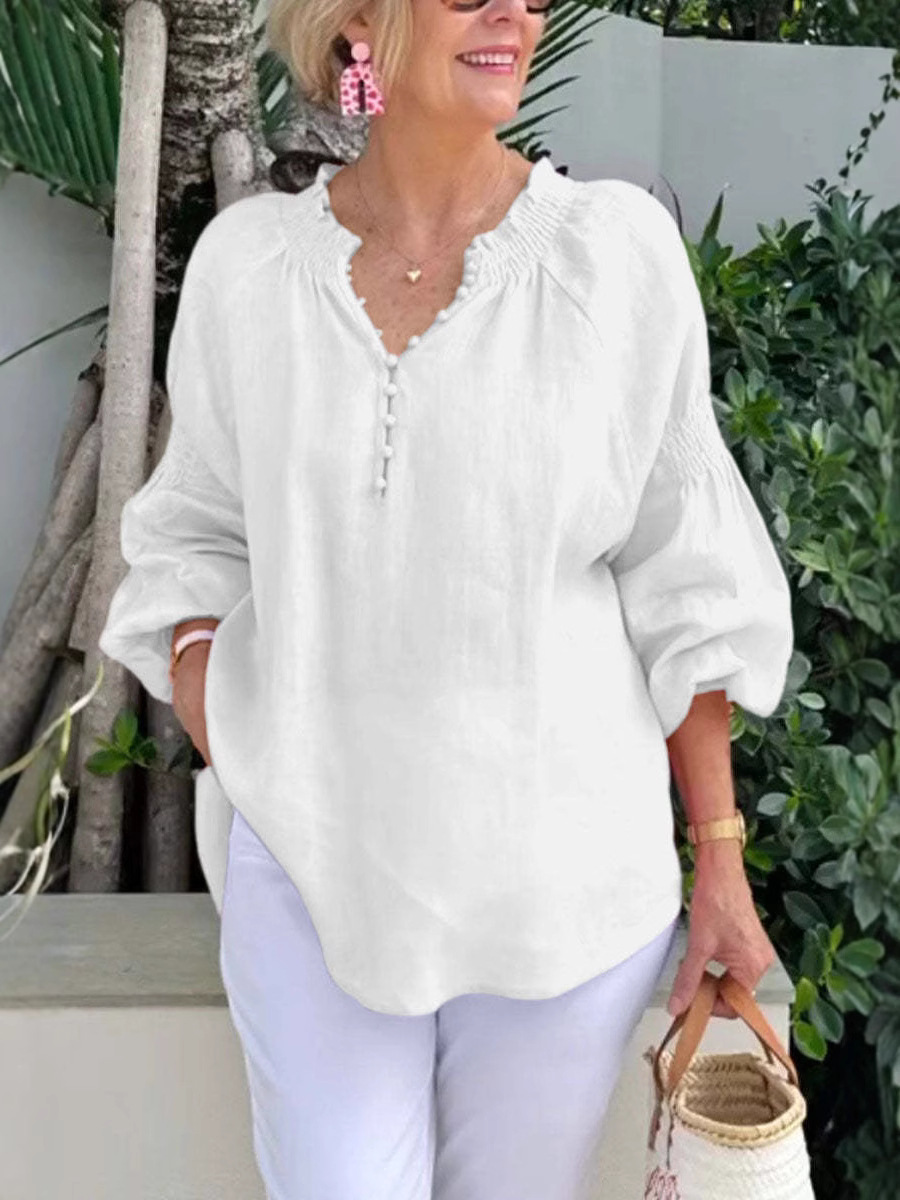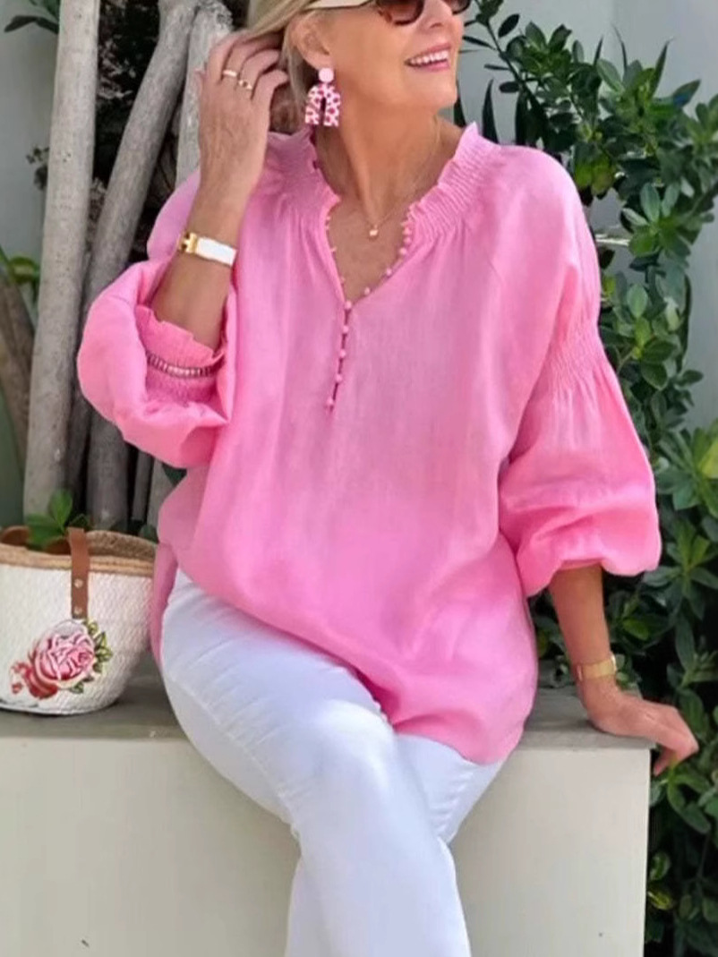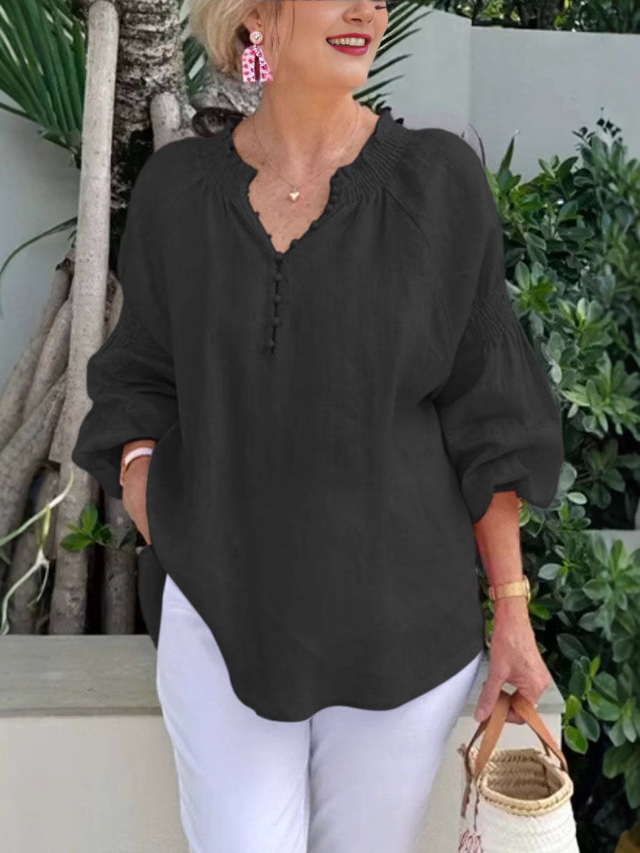 Casual V-neck Solid Color Cotton and Linen Long Sleeve Top
