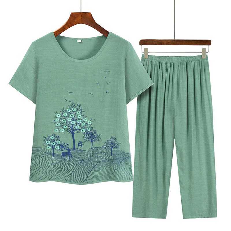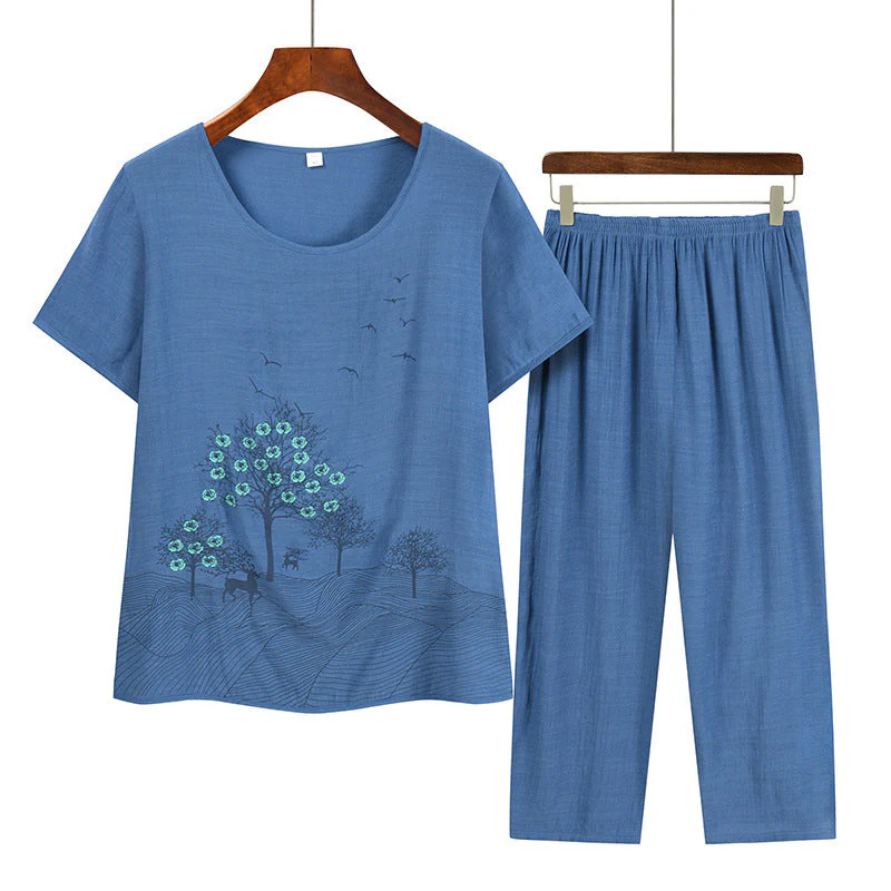 - Stil: costum din două piese (mânecă scurtă + pantaloni capri)