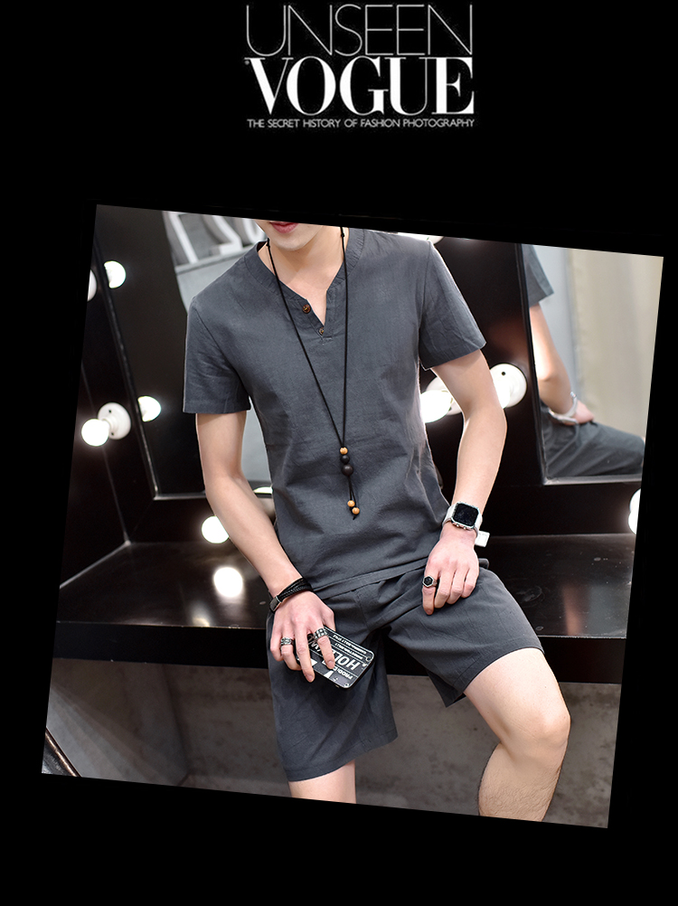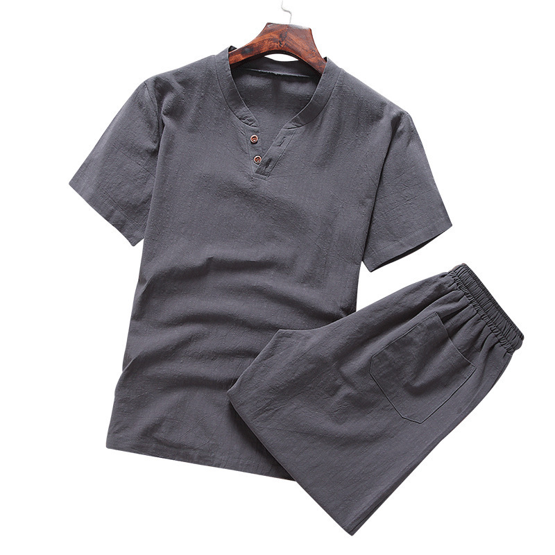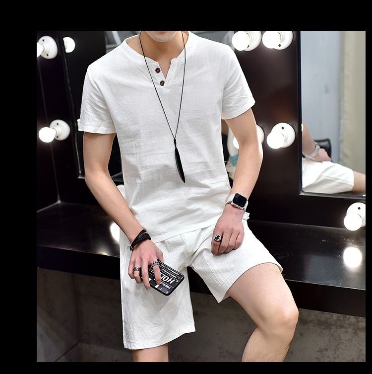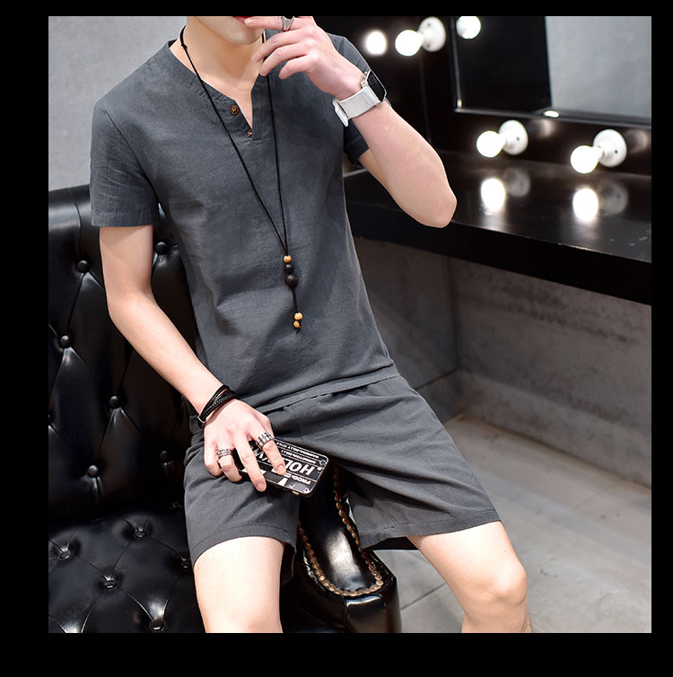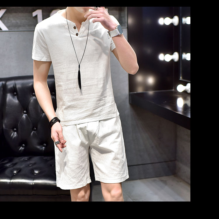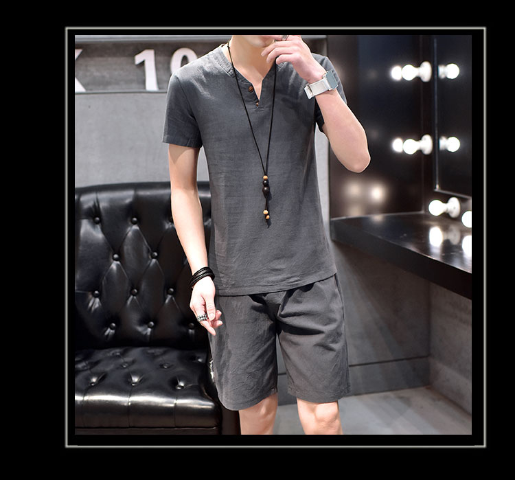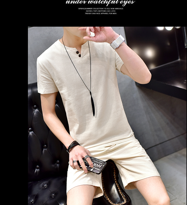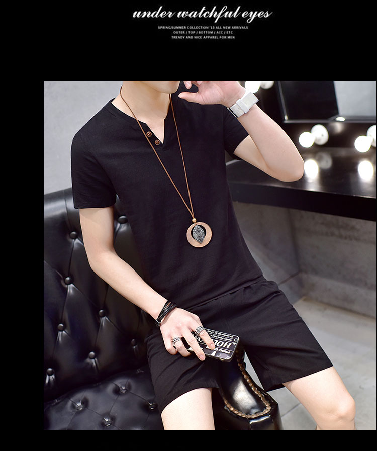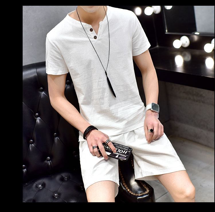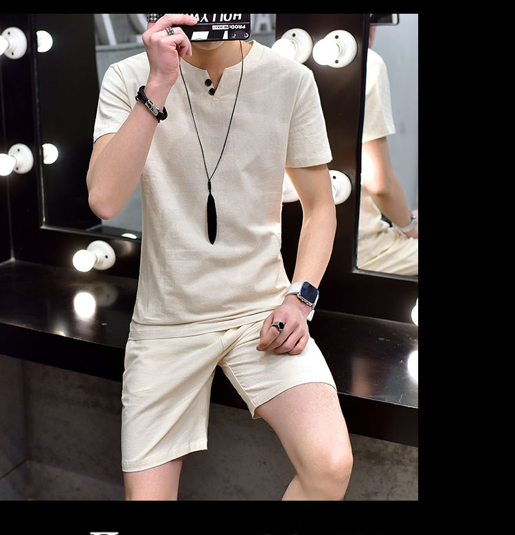 Cotton linen suit men's T-shirt short sleeve summer new large size youth solid V-collar short sleeve set