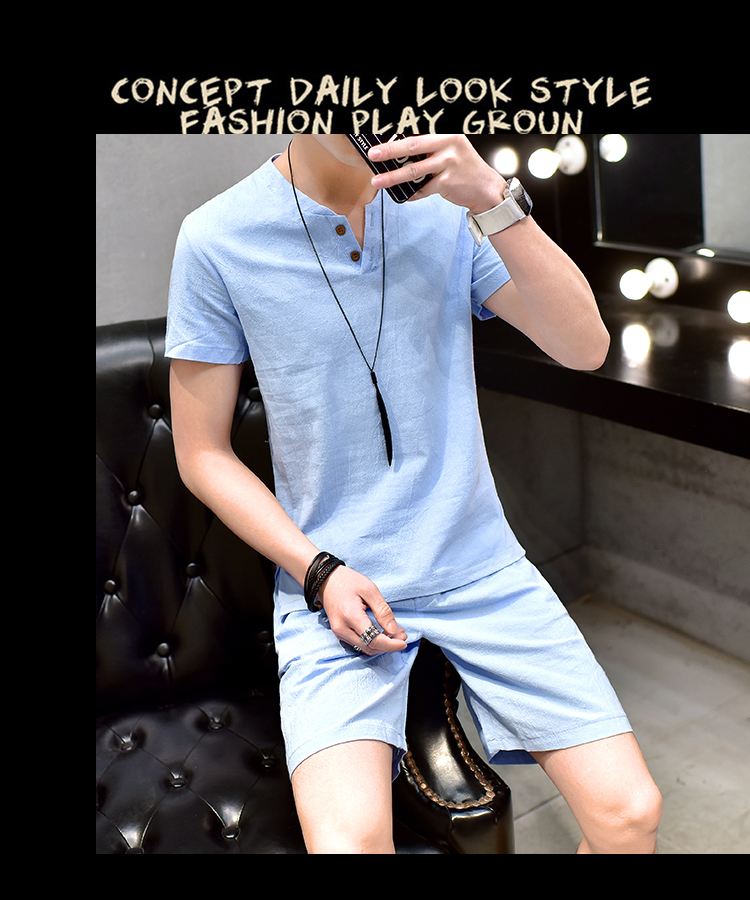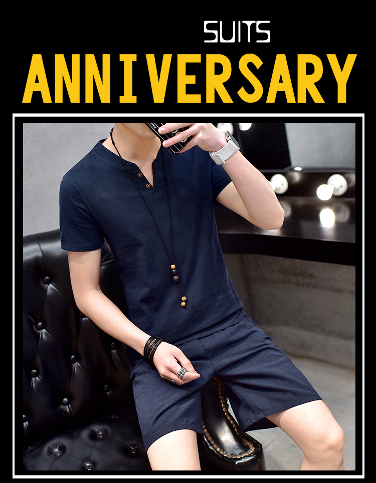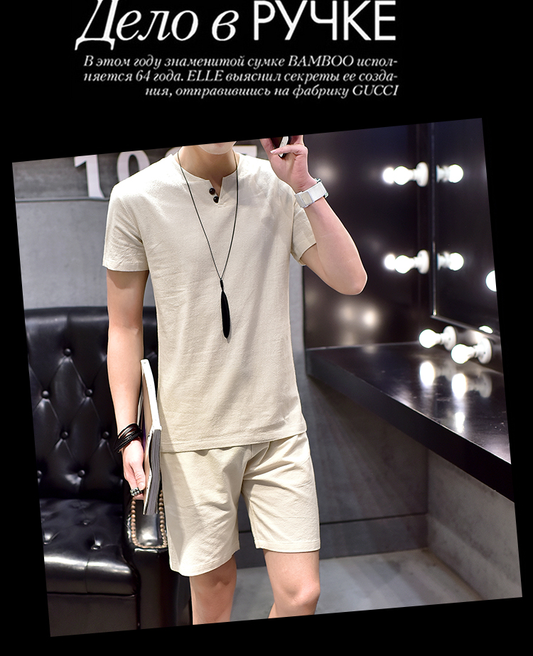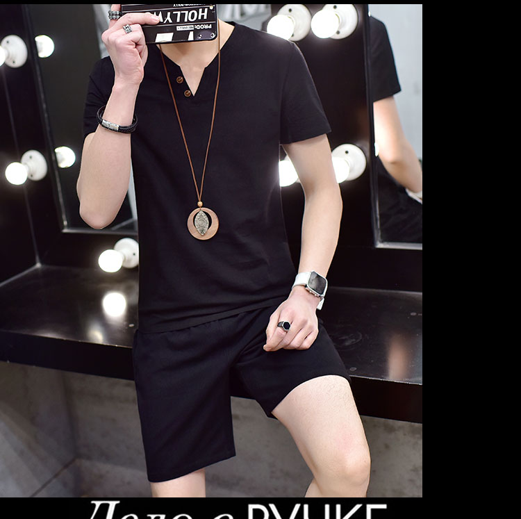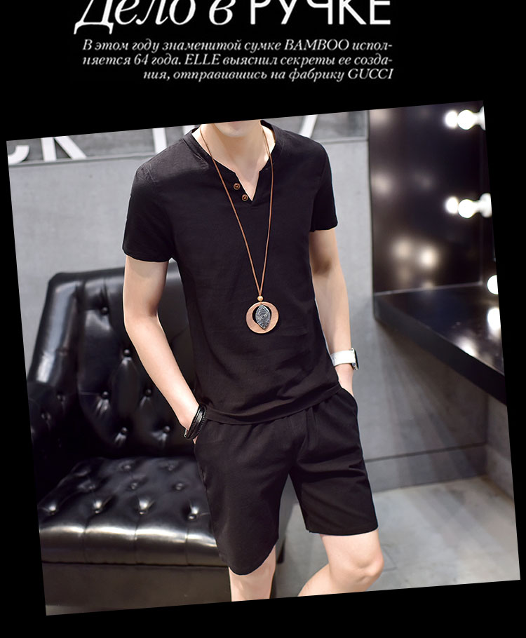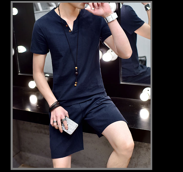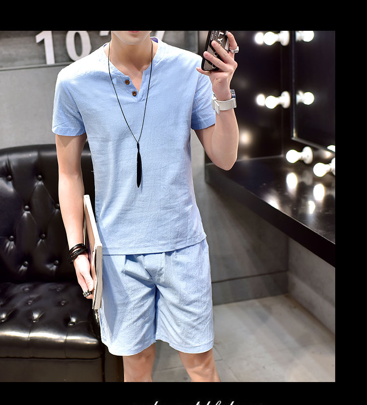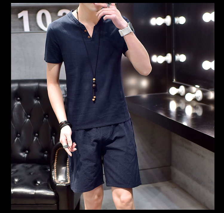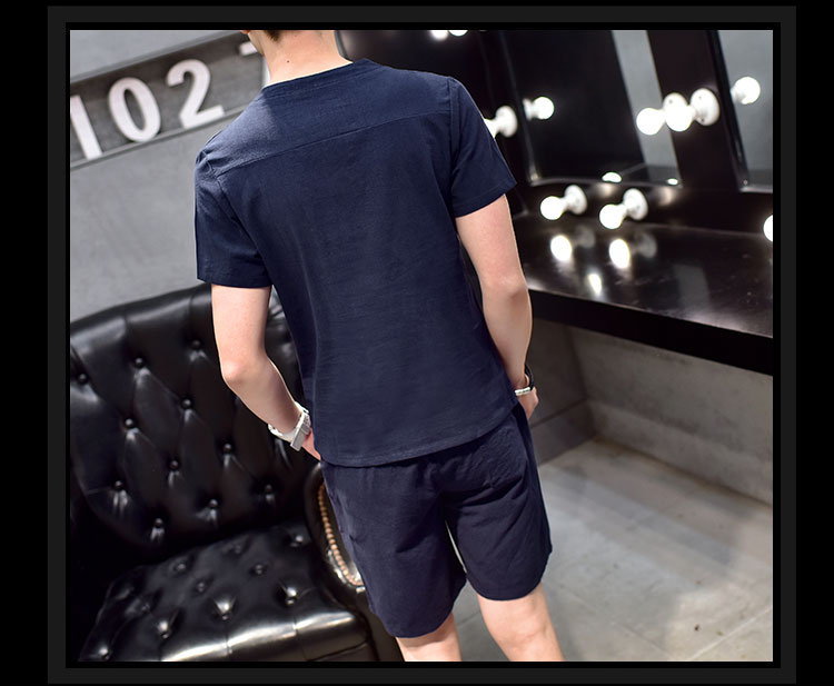 Cotton linen suit men's T-shirt short sleeve summer new large size youth solid V-collar short sleeve set