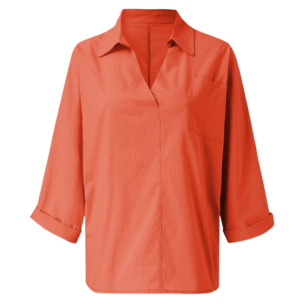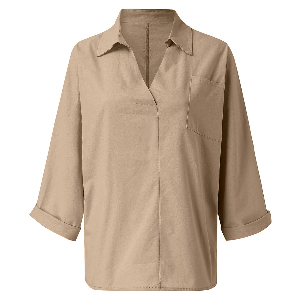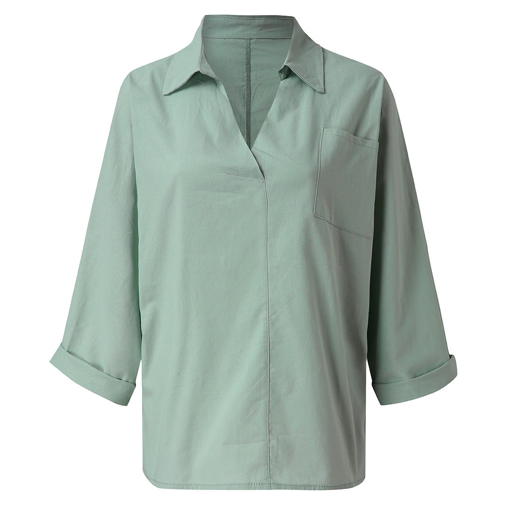 Large Size Solid Color Imitation Cotton and Linen V-neck Long Sleeve Pullover Top