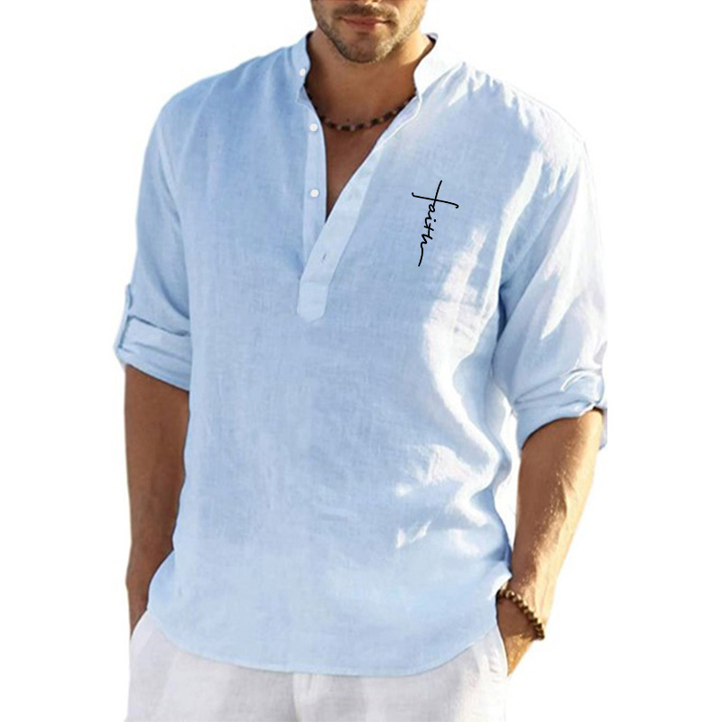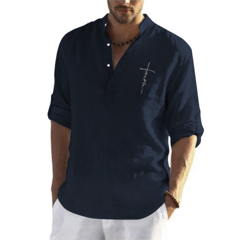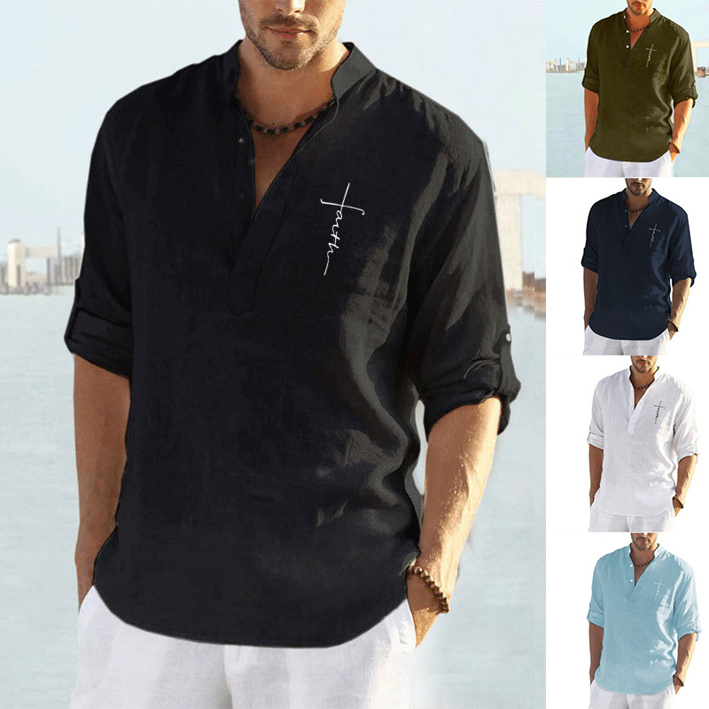 men's large size long sleeve half open collar shirt loose cotton and linen shirt factory wholesale men's clothing