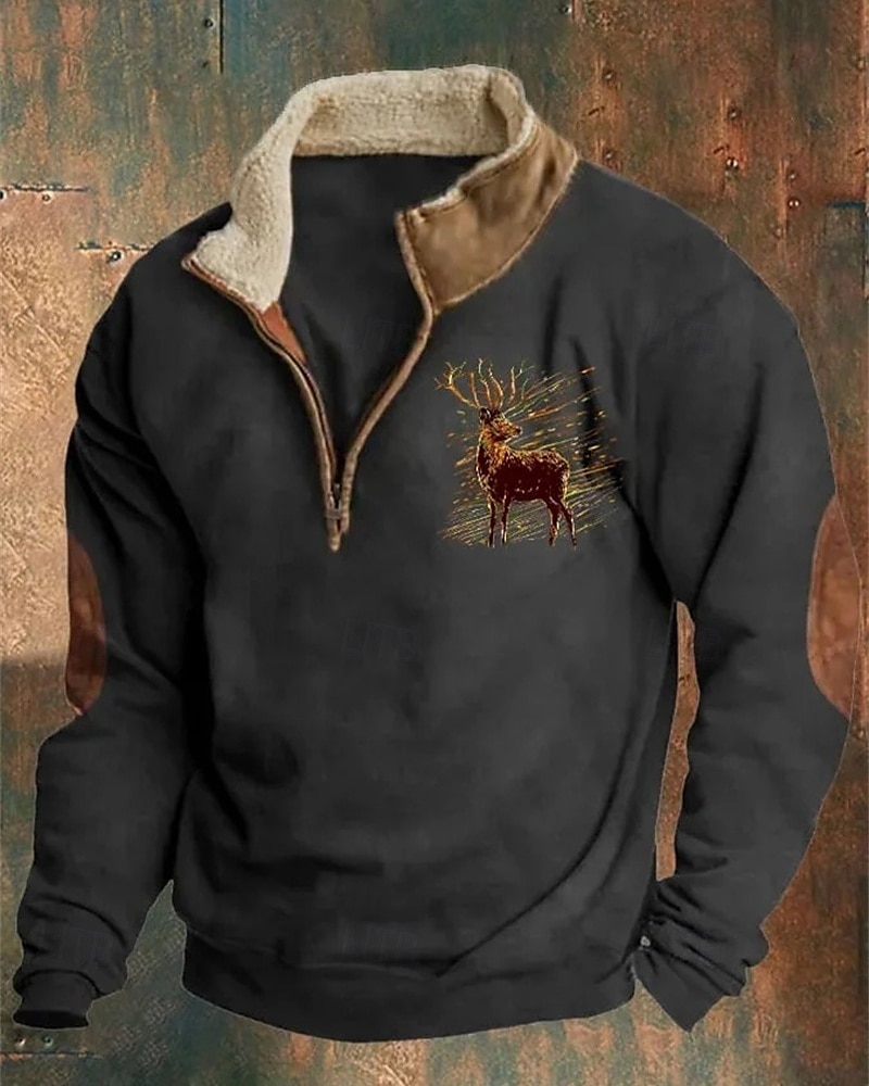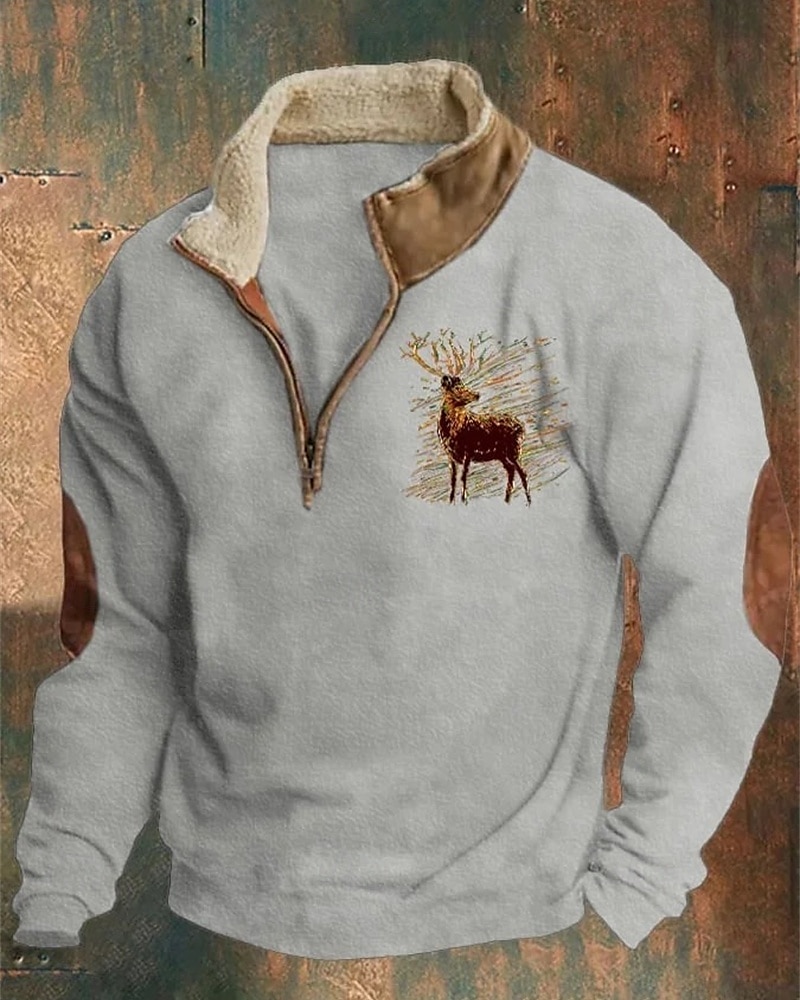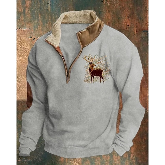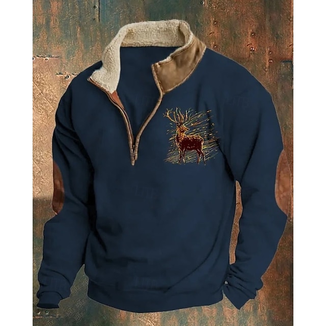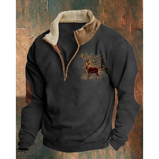 Gender:Men's,Style:Casual,Streetwear,Thin fleece,Occasion:Sportswear,Christmas,Holiday,Daily,Sports Clothing Sub Category:Quarter Zip Sweatshirt,Sweatshirt,Tops Type:Basic Sweatshirts,Neckline:Half Zip,Fabric:Polyester,Design:Print,Sleeve Length:Long Sleeve,Elasticity:Micro-elastic,Look After Me:Wet and Dry Cleaning,Washable,Pattern:Reindeer,Season:Fall & Winter,