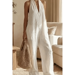 Halter Neck Linen Jumpsuit | Women's Wide Leg One Piece Outfit