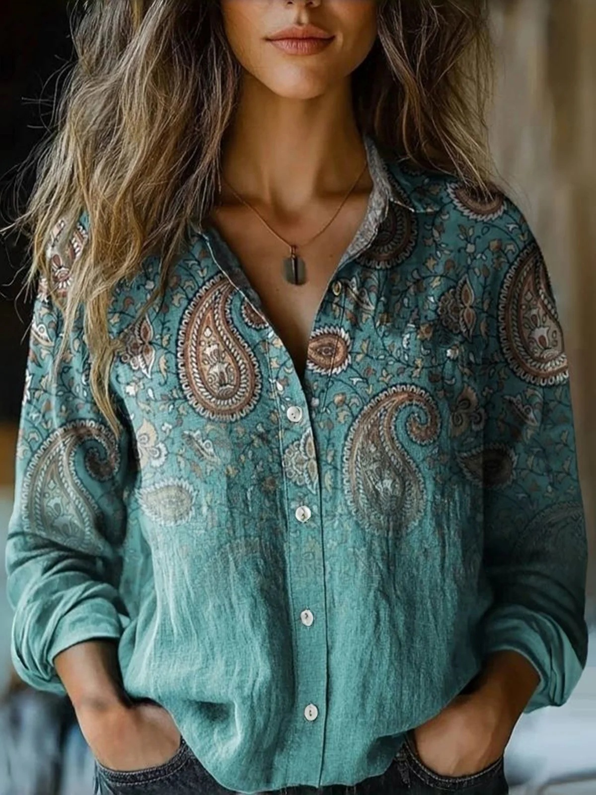 Retro Printed Long-sleeved Casual Shirt Imitation Cotton and Linen Shirt
