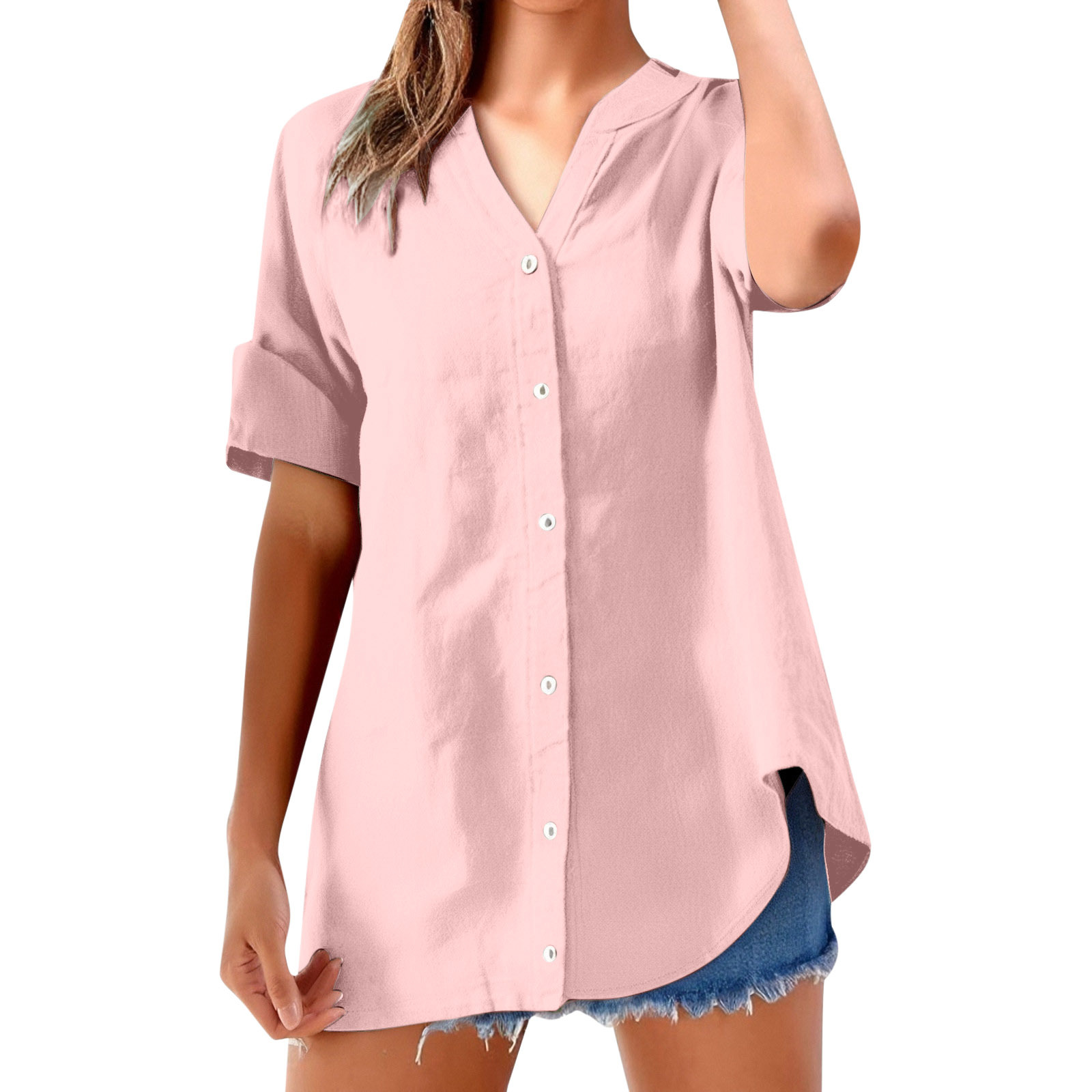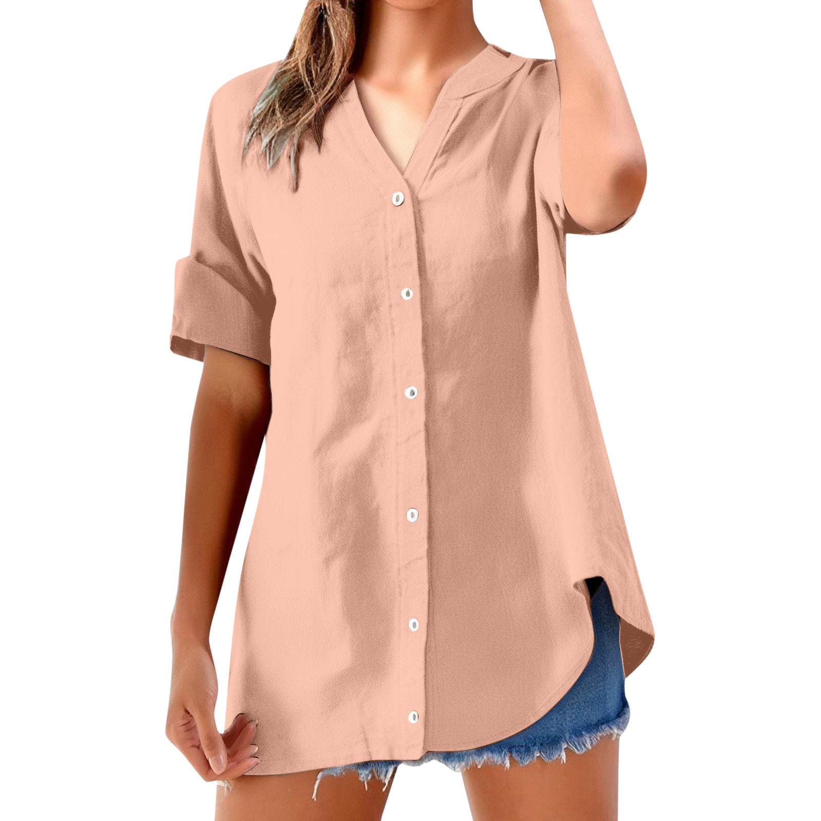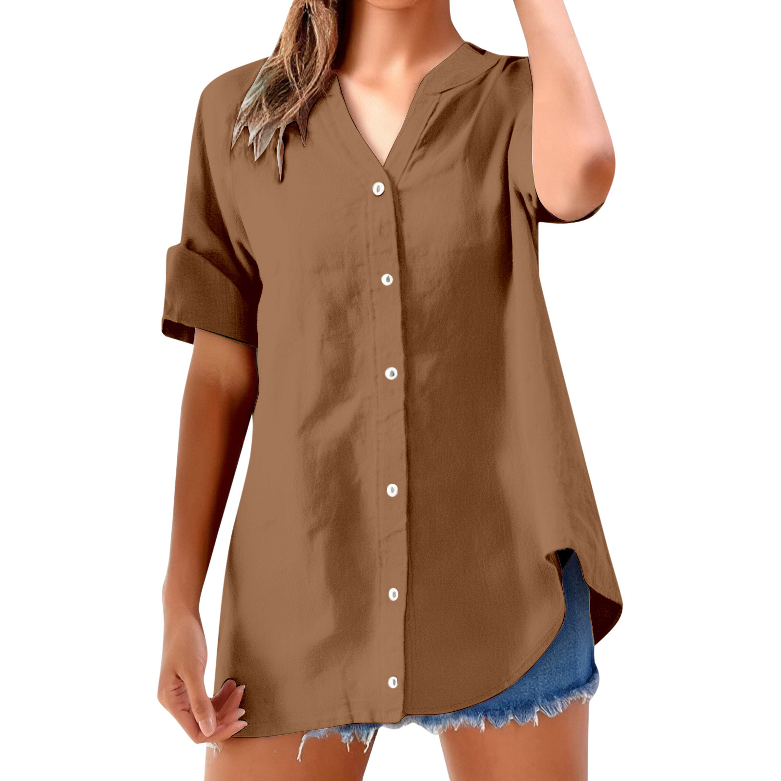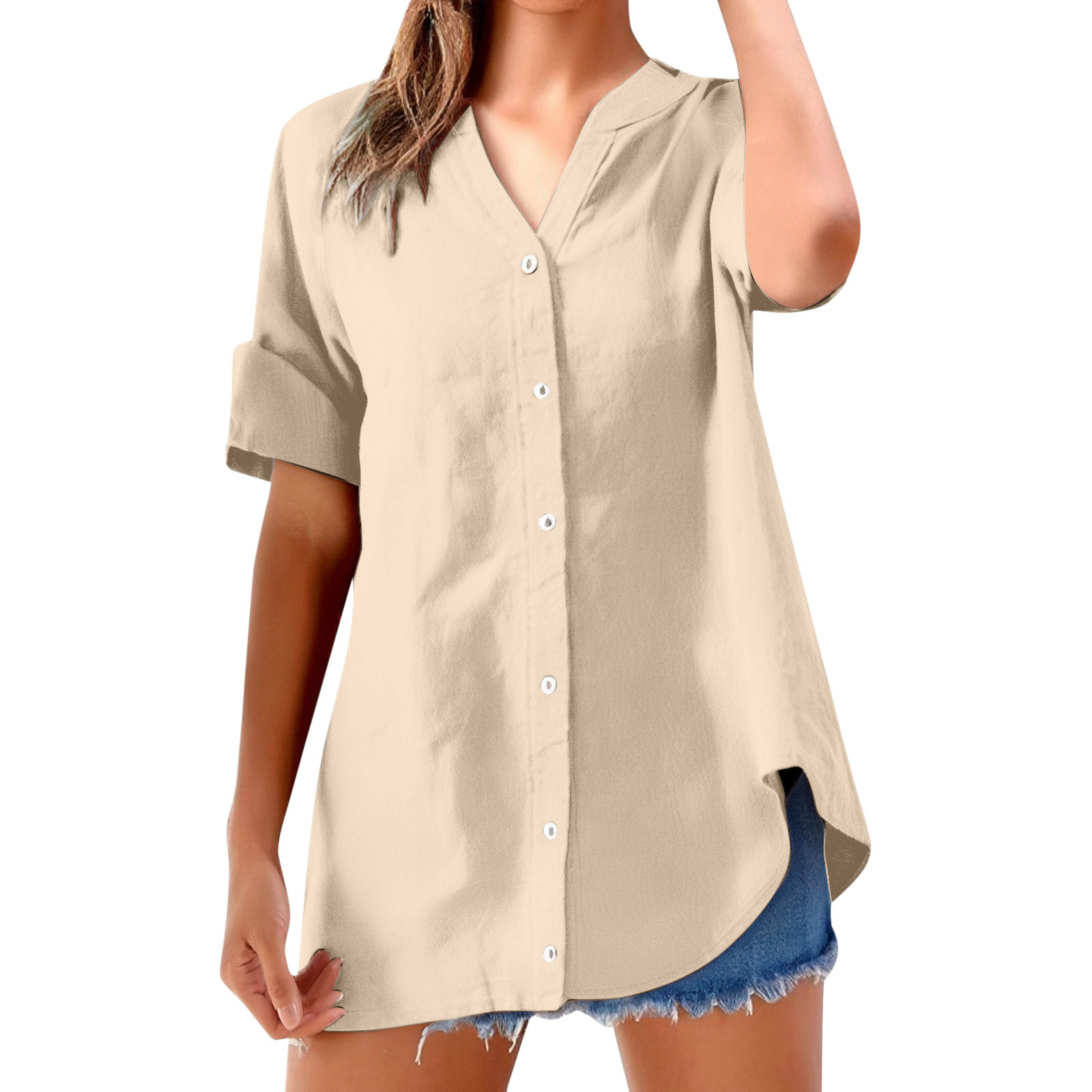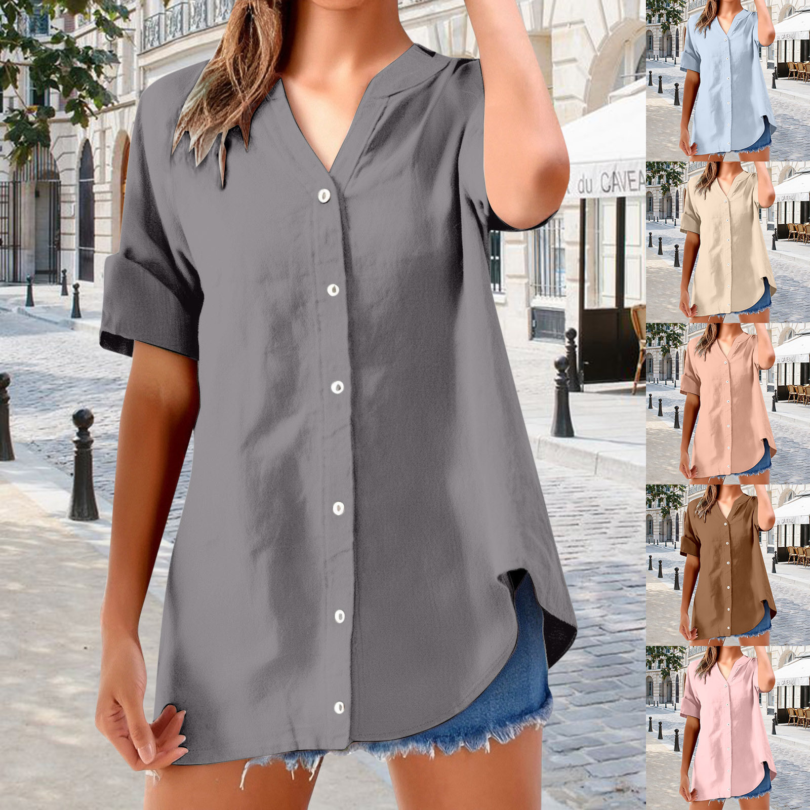 Solid Color Collar Button Short Sleeve Shirt Top Women