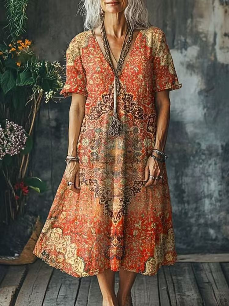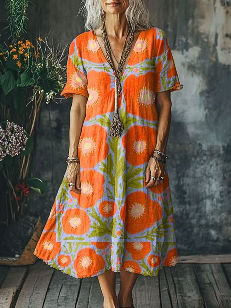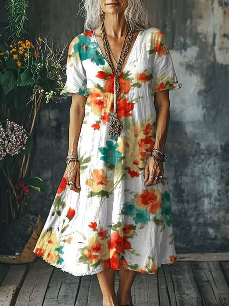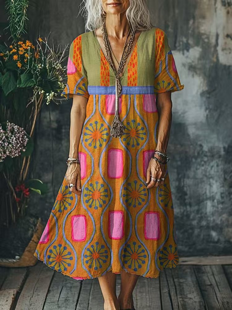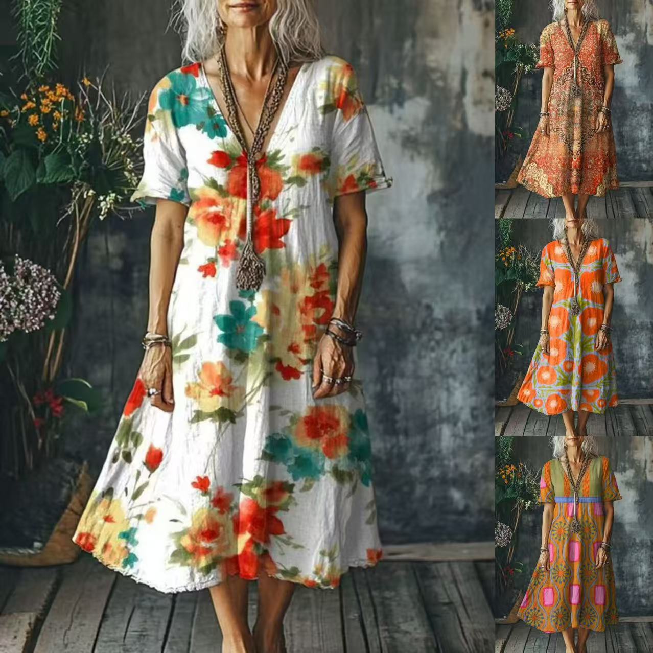 Eye-Catching Boho Floral & Abstract Prints: Features a range of vibrant, artistic prints—from watercolor florals to retro geometric patterns—on a relaxed silhouette, adding a whimsical, bohemian charm to your summer wardrobe. The deep V-neckline elongates the neck and flatters the face, creating a feminine, laid-back look.