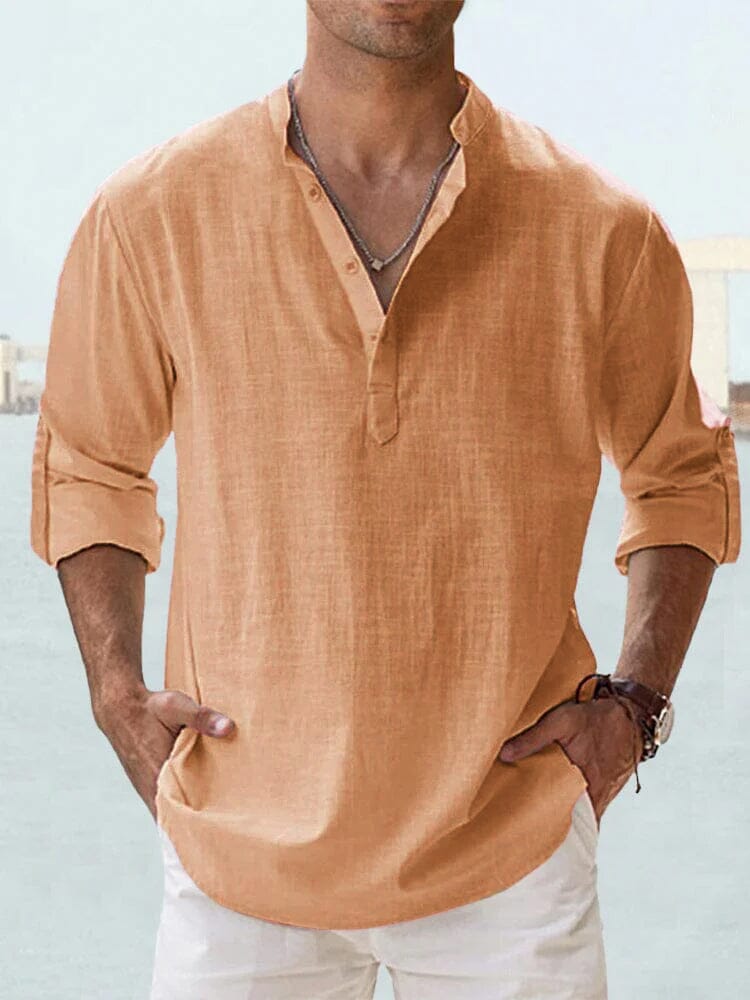 Sleeve, half button closure, soft touch, lightweight and breathable fabric.